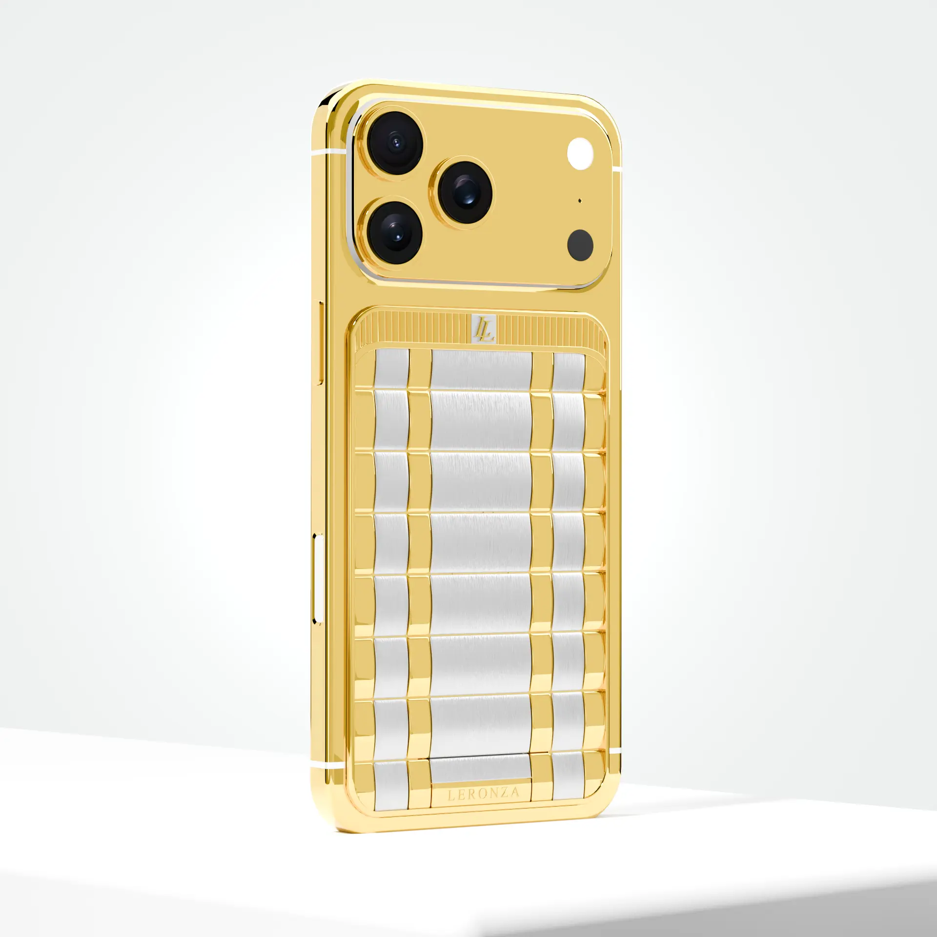 The Luxoro Edition redefines the language of luxury with a bold and artistic expression of craftsmanship. This elite iPhone 17 Pro & Pro Max features a sculpted back design with alternating vertical elements—each meticulously crafted in 18K Solid Gold and premium Silver. The dual-metal composition evokes harmony and contrast, making this piece a true work of art.