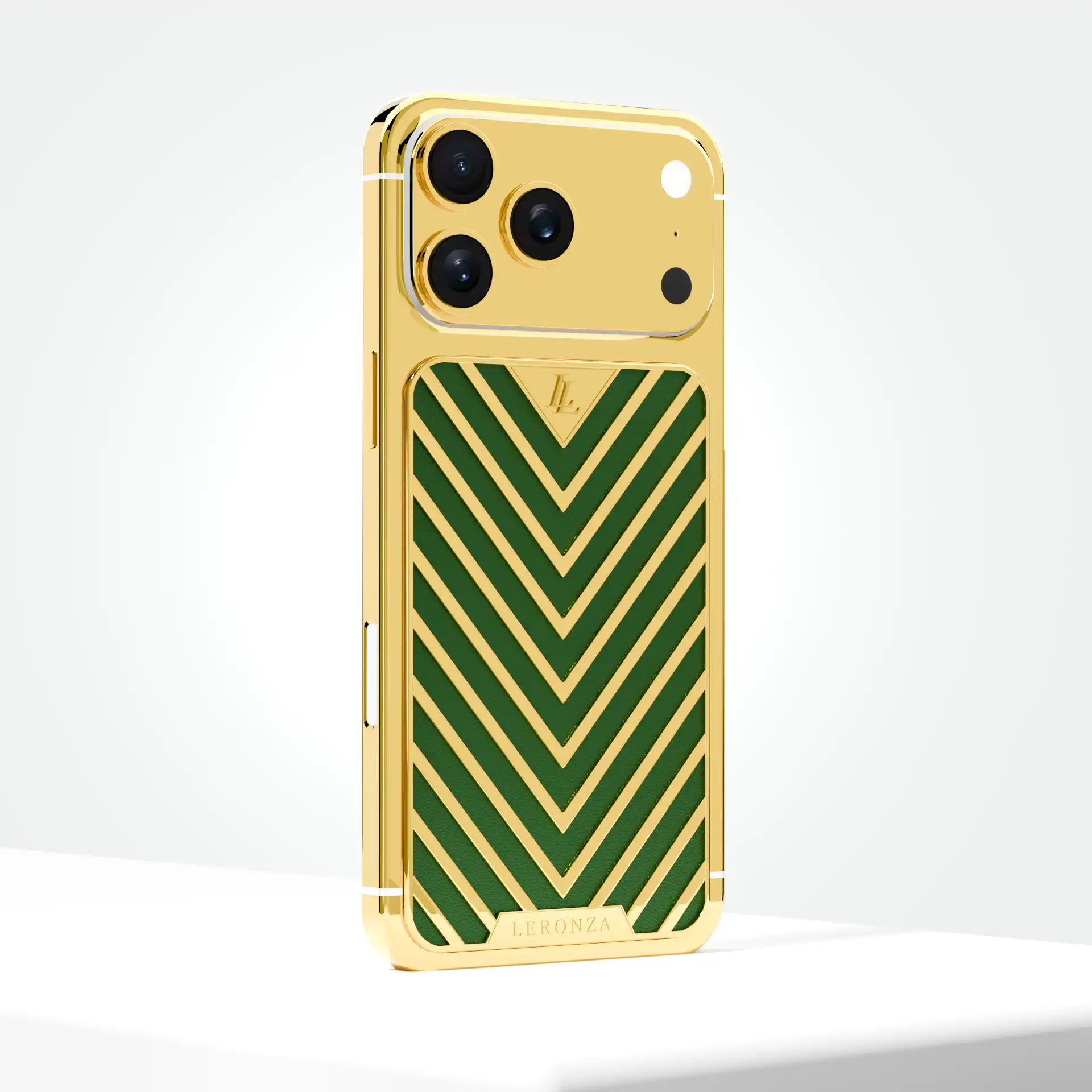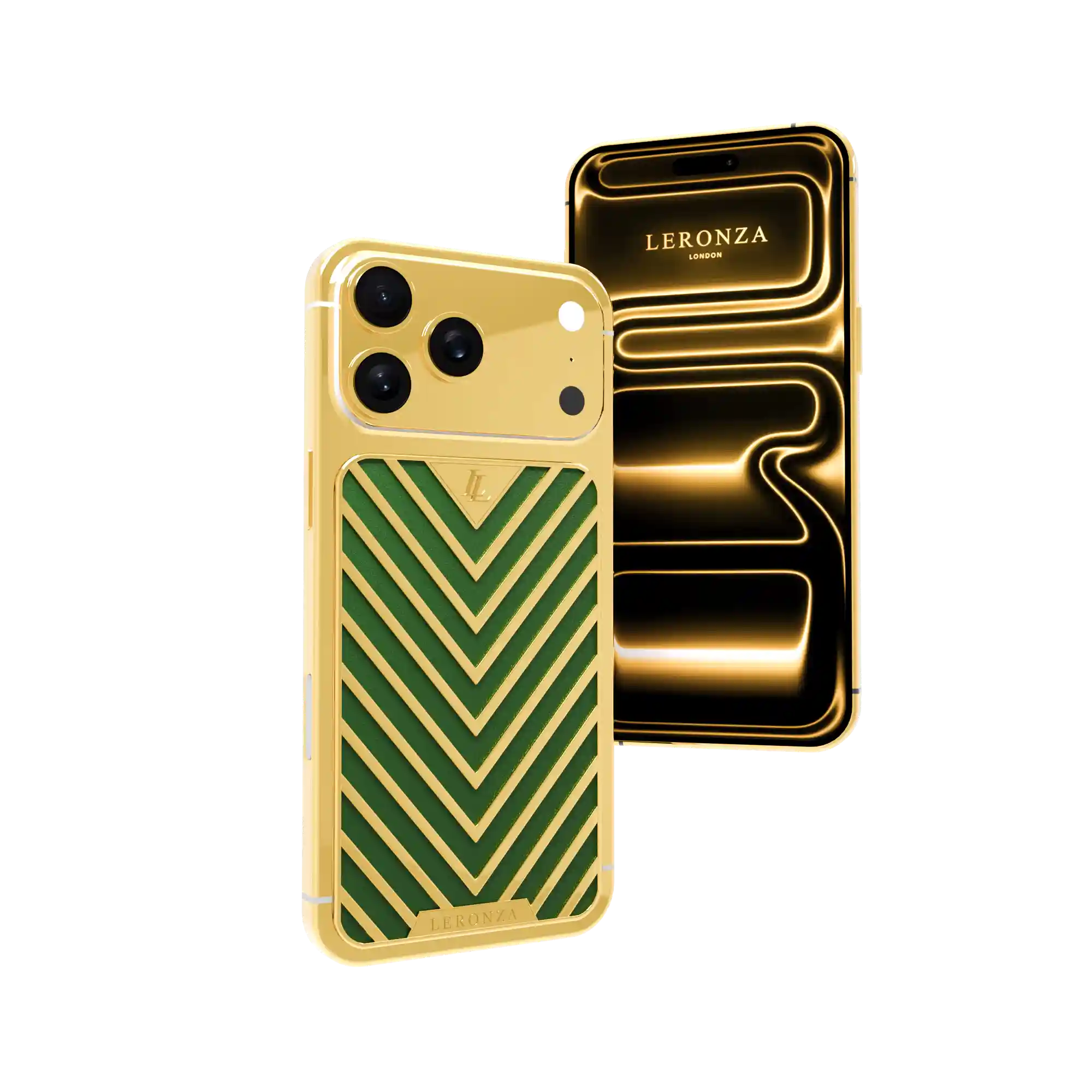 The Viridian Edition is a celebration of contrast — where the enduring power of gold meets the life-affirming spirit of nature. This extraordinary creation begins with a meticulously machined back plate, handcrafted in pure 18K Solid Gold, engineered into a bold, geometric chevron motif that creates depth, flow, and perfect visual symmetry. Each line is precisely cut to reflect light, casting subtle shadows that shift with every movement, giving the phone a dynamic, sculptural quality.