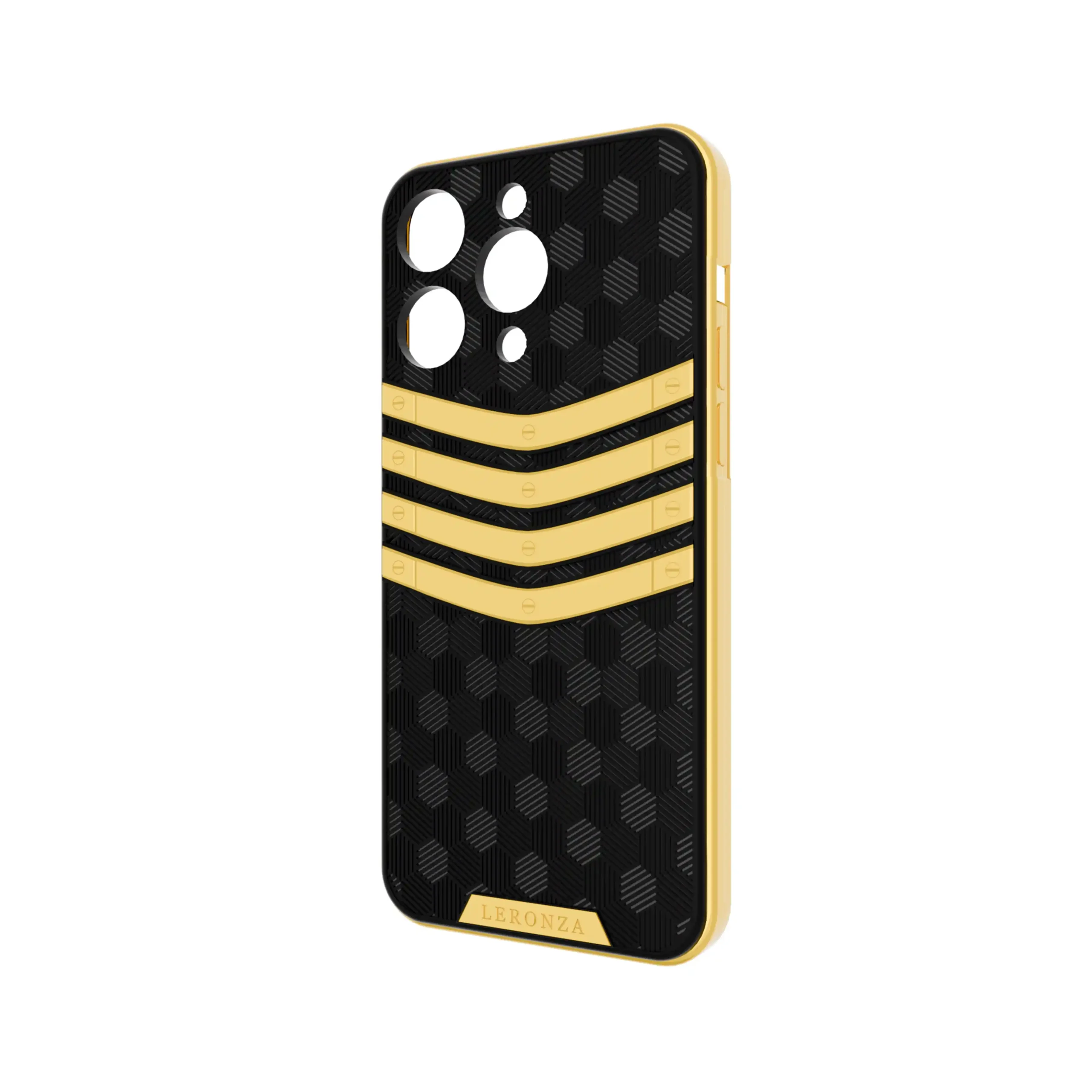 Experience luxury with the Leronza 24K Gold Apple iPhone Nucleus 3.0 Case. Plated in 24K Gold and Platinum (5-7 microns thick), it exudes lasting shine and elegance. The design is further enhanced by 24K gold elements, which add a touch of opulence to the overall aesthetic. Personalize it by engraving your name or initials on the backplate or frame.