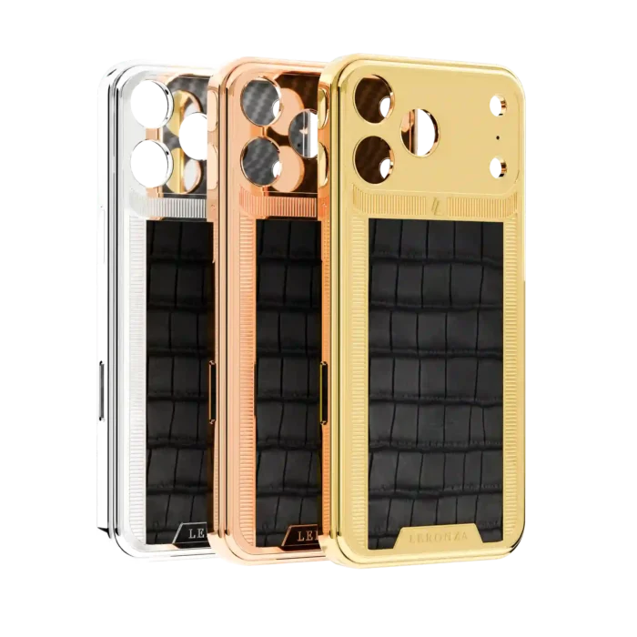 24K Gold or Platinum iPhone WildGrace Victory Leather case is available for models 13, 14, 15, and 16 Pro & Pro Max.