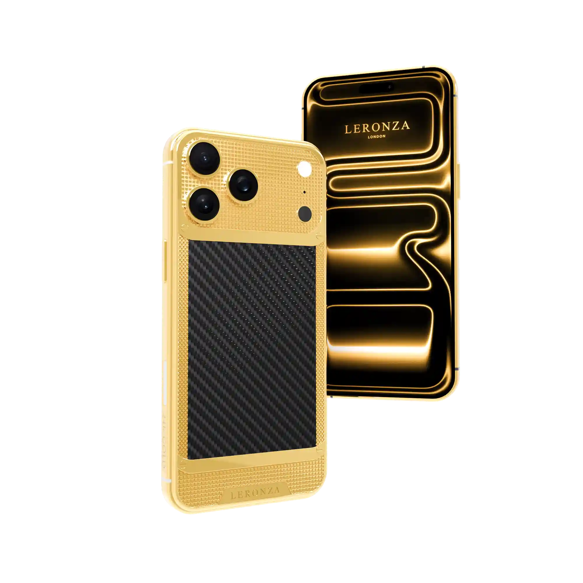 The Leronza 24K Gold Apple iPhone 17 Pro and Pro Max CarbonFiber Victory Edition exemplifies luxury and strength. The case and backplate are expertly plated in three prestigious finishes—24K Gold, Rose Gold, and Platinum—with a thickness of 5 to 7 microns, ensuring a lasting and brilliant shine. This edition is further elevated by the use of real CarbonFiber, intricately crafted into a 3D design that symbolizes strength and power. Named the CarbonFiber Victory, this design is a true testament to opulence and resilience. For a personal touch, you have the option to engrave your name or initials on the backplate or frame, making this iPhone uniquely yours.