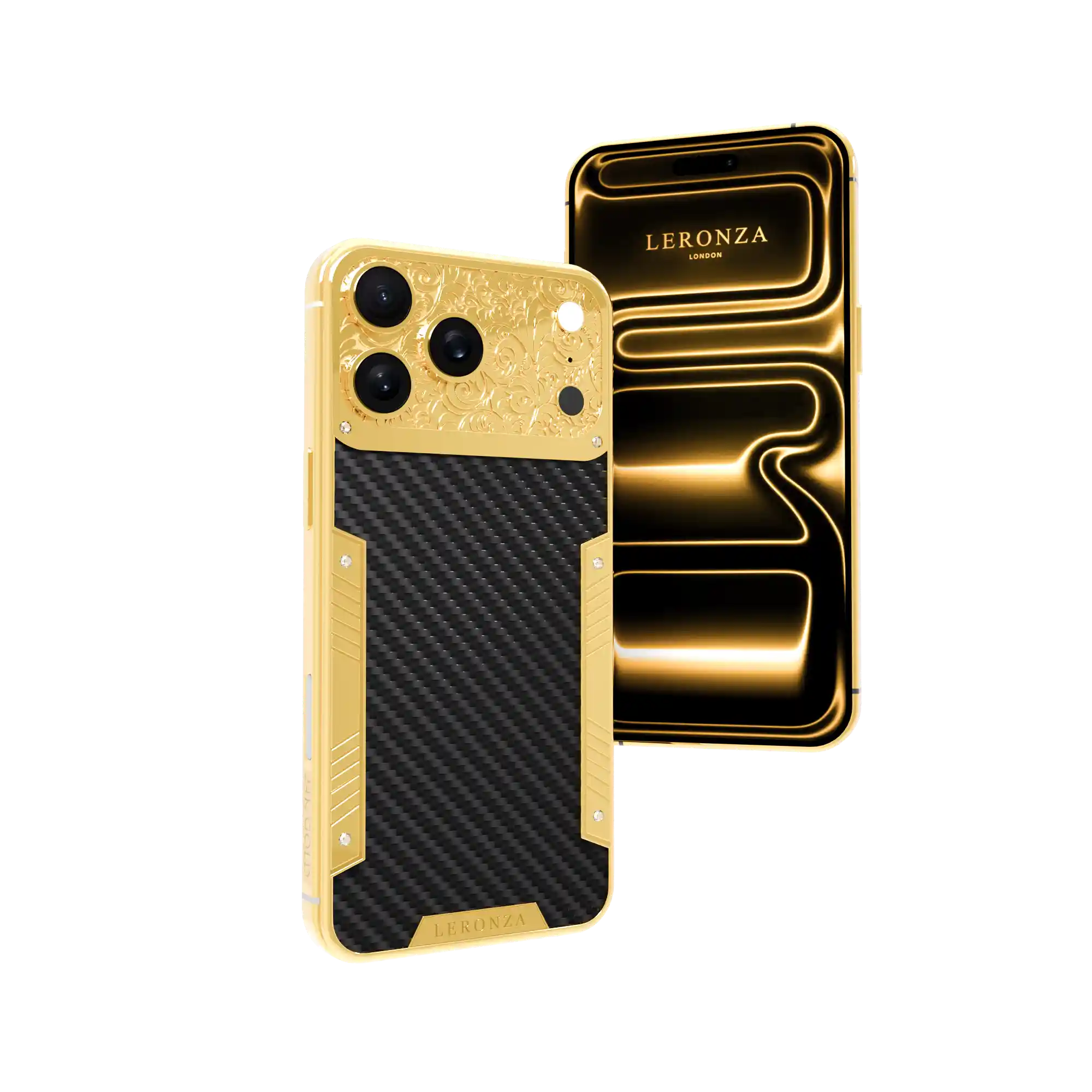 The Leronza 24K Gold Apple iPhone 17 Pro and Pro Max CarbonFiber Royale Edition is a stunning fusion of luxury and artistry. The case and backplate are plated in three exquisite finishes—24K Gold, Rose Gold, and Platinum—with a thickness of 5 to 7 microns, ensuring a lustrous and durable surface. The design is further enhanced with real CarbonFiber inlays, featuring a hand-drawn floral pattern inspired by the baroque style, named "Flora." This intricate design embodies the elegance and power of the baroque era, making the Royale Edition a true masterpiece. For a personalized touch, you can engrave your name or initials on the backplate or frame, adding a unique element to this luxurious iPhone.