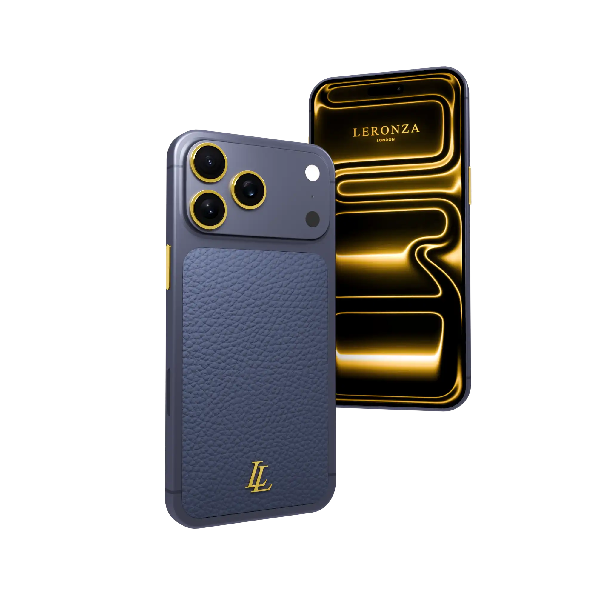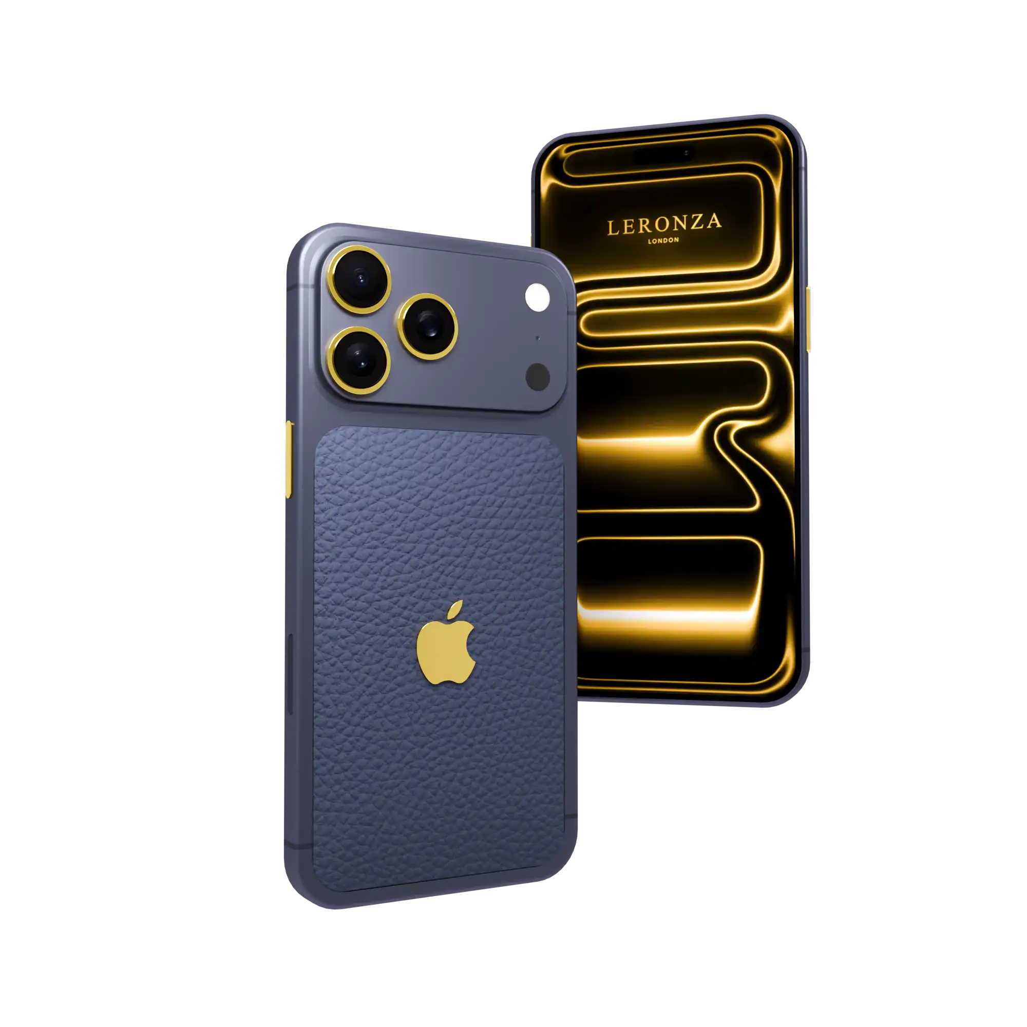 The unibody structure showcases its original seamless finish, elevated with meticulously plated 24K Gold accents adorning the camera rings, side buttons, and logo detailing. To add a personal mark of exclusivity, clients may choose between the timeless Apple logo or the distinguished Leronza emblem.