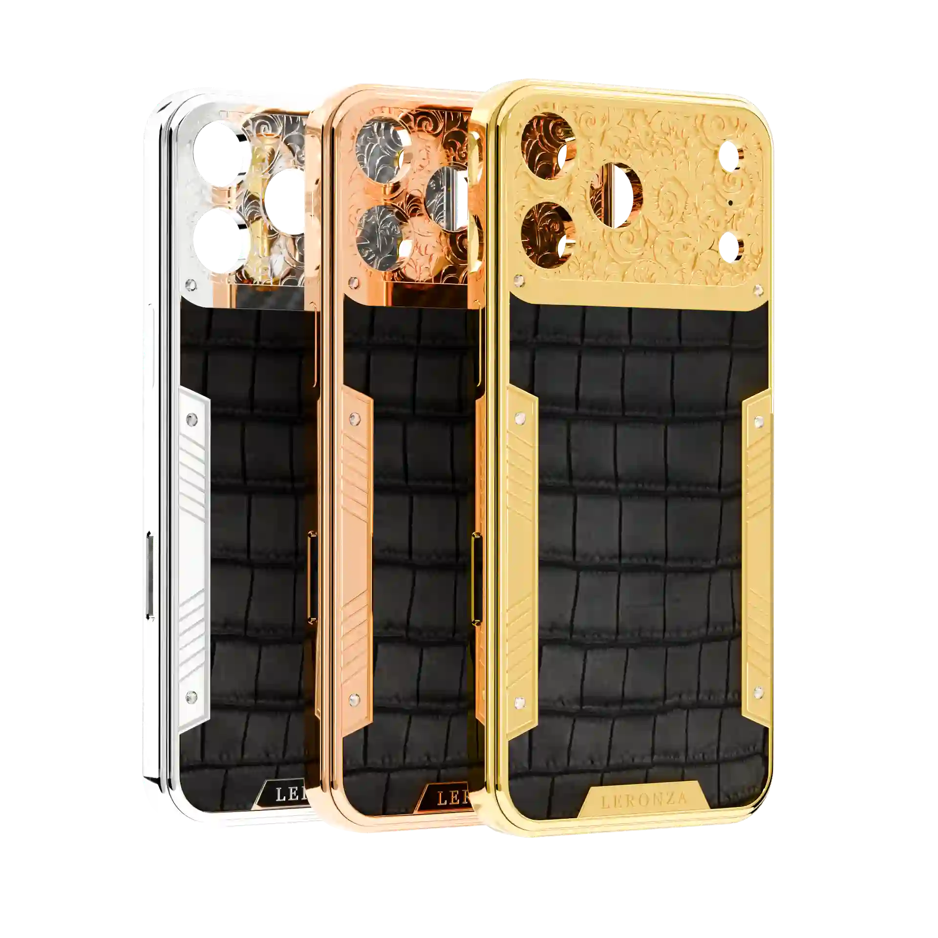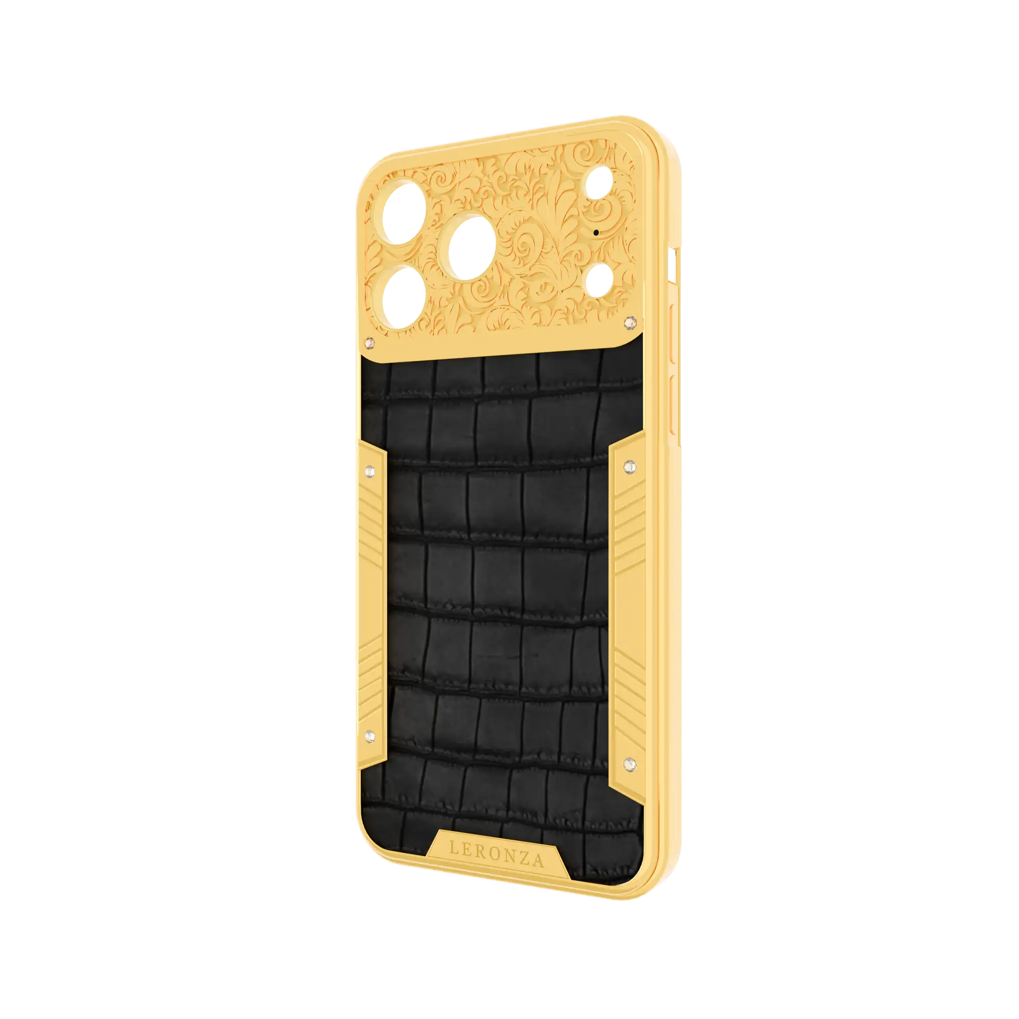 Experience unparalleled luxury with the Leronza 24K Gold Apple iPhone Exotic Royale flora leather Case. Meticulously plated in 24K Gold and Platinum (5-7 microns thick), it exudes lasting shine and elegance. The design is further enhanced with real crocodile leather skin, intricately customized with a baroque-inspired flora design. Personalize it by engraving your name or initials on the backplate or frame.