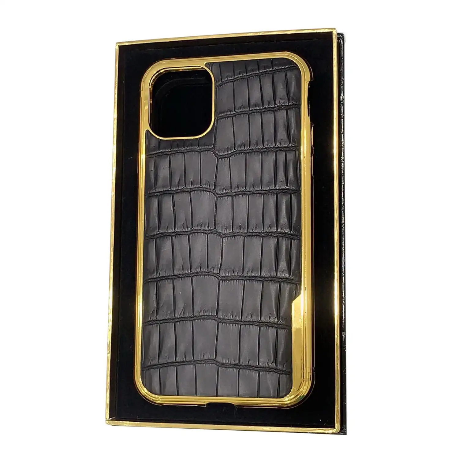 Enhance your iPhone with the Leronza 24K Gold Crocodile Leather Case Black. Delivered to you in just 2 weeks!