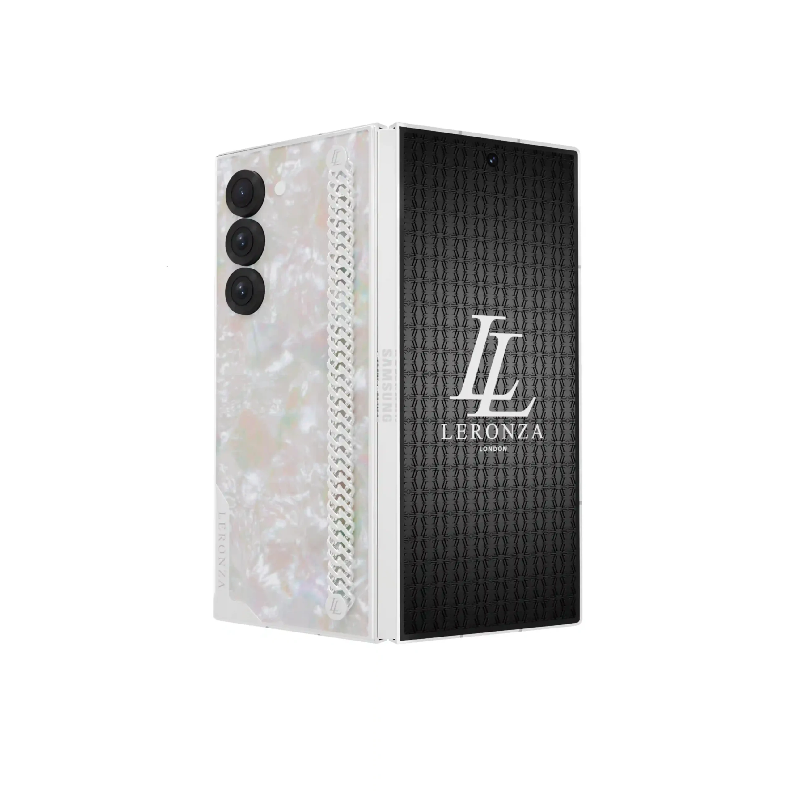 The Leronza 24K Gold Samsung Galaxy Z Fold7 Pearl Majesty Link Edition represents the ultimate in luxury and craftsmanship. The case and backplate are expertly plated in three stunning finishes—24K Gold, Rose Gold, and Platinum—with a thickness of 5 to 7 microns, ensuring a rich, long-lasting luster. The design is further elevated with real Mother of Pearl inlays, adding a touch of timeless elegance. The bracelet design is inspired by the Miami Cuban Link, a symbol of good luck, strength, and power, and has been aptly named the Majesty Link. For a truly personalized experience, you have the option to engrave your name or initials on the backplate or frame, making this Phone uniquely yours.
