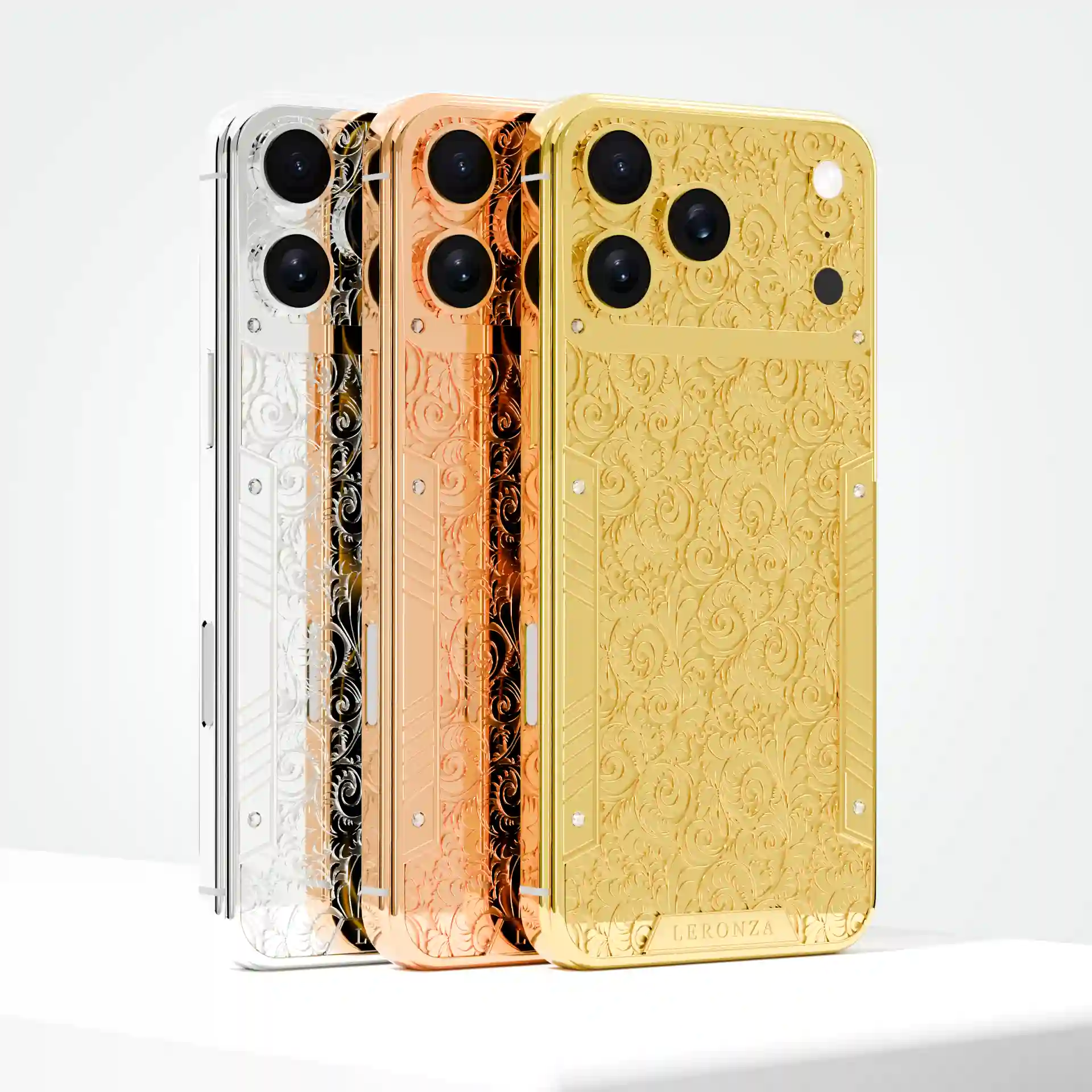 The Leronza 24K Gold Apple iPhone 17 Pro and Pro Max Flora is an embodiment of luxury and artistry, featuring world-class plating available in 24K Gold, Rose Gold, or Platinum. Each finish is meticulously applied with a thickness of 5 to 7 microns, ensuring durability and a premium feel. The standout feature of this model is the intricate flora design, inspired by baroque-style hand drawings, which gives the phone an air of elegance and classic beauty. The design is named "Flora" to capture the essence of its delicate and ornate patterns. To make your iPhone truly personal, you have the option to engrave your name or initials on the backplate or frame, adding a unique touch to your device.