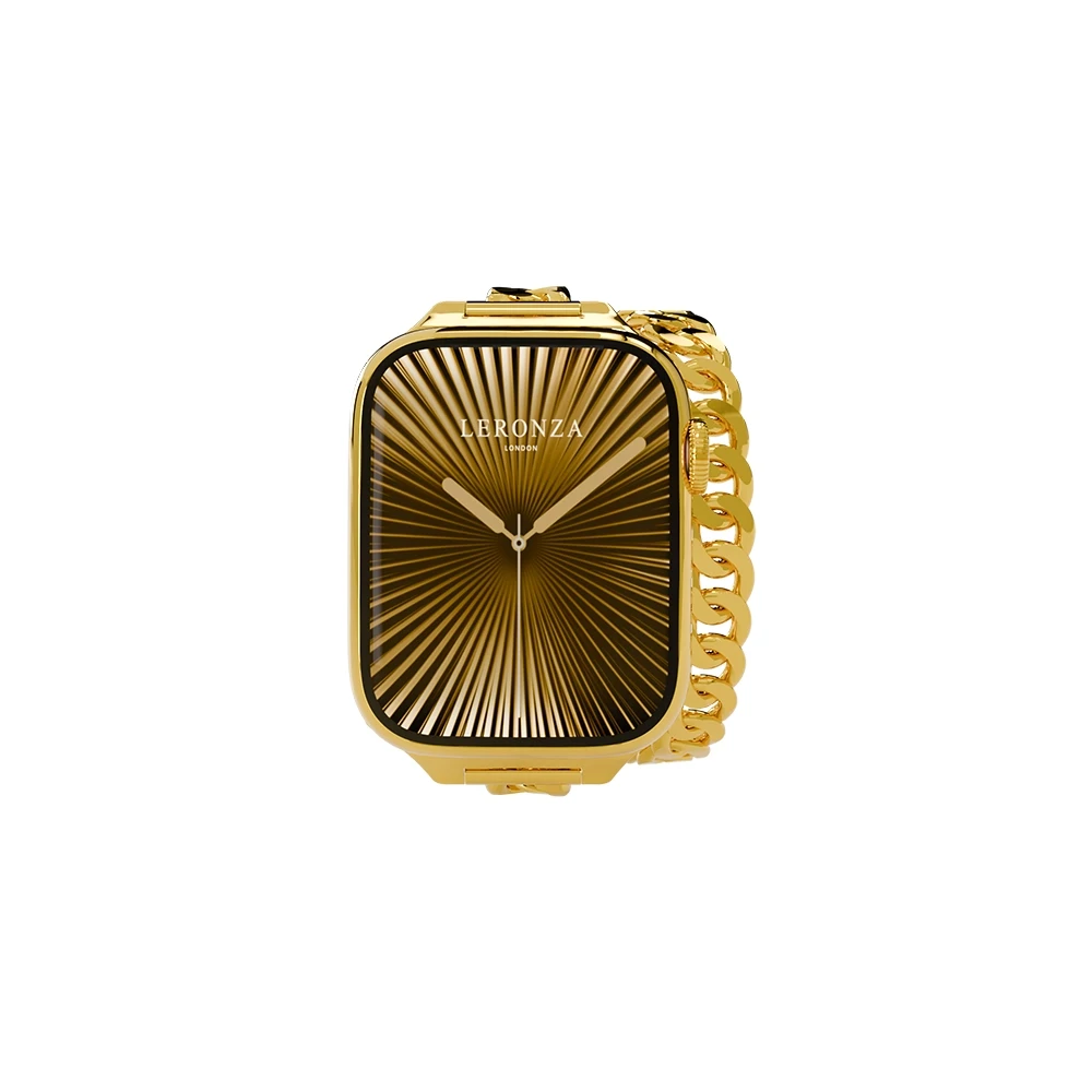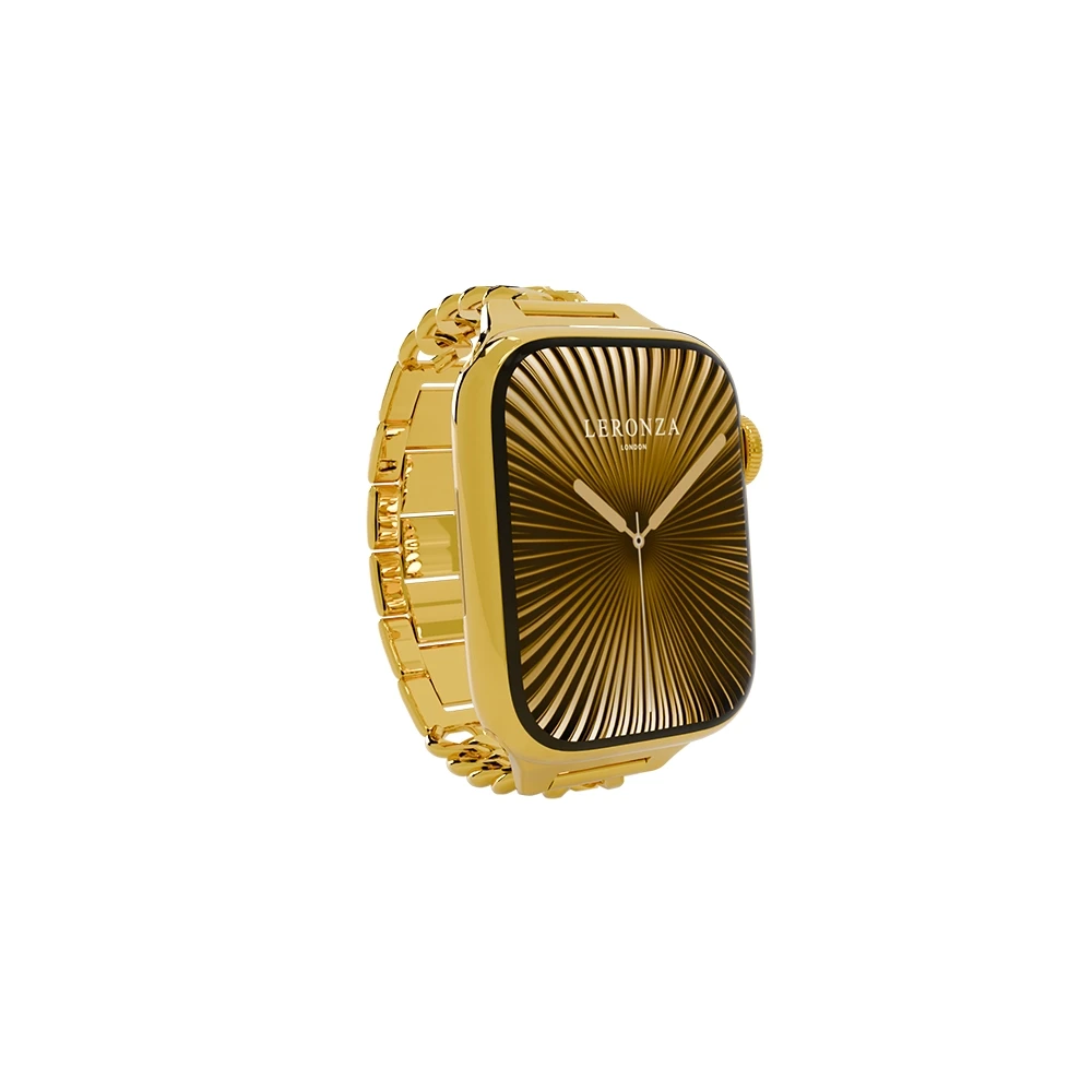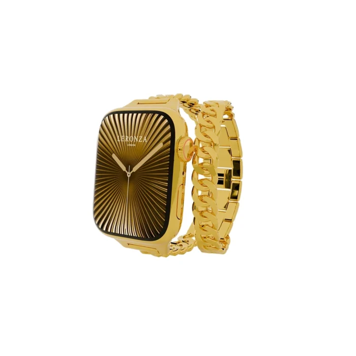 The 24K Gold Apple Watch Series 10 Twin Twist Strap features Leronza’s signature plating options in 24K Gold, Rose Gold, and Platinum, each applied with a thickness of 5 to 7 microns. This luxurious plating not only adds sophistication to the watch but also ensures its durability and longevity. The Twin Twist Strap’s unique design creates the illusion of wearing both a watch and a bracelet, making it an elegant accessory for both parties and daily wear. It’s a versatile statement piece that complements any outfit with a touch of refined luxury.
