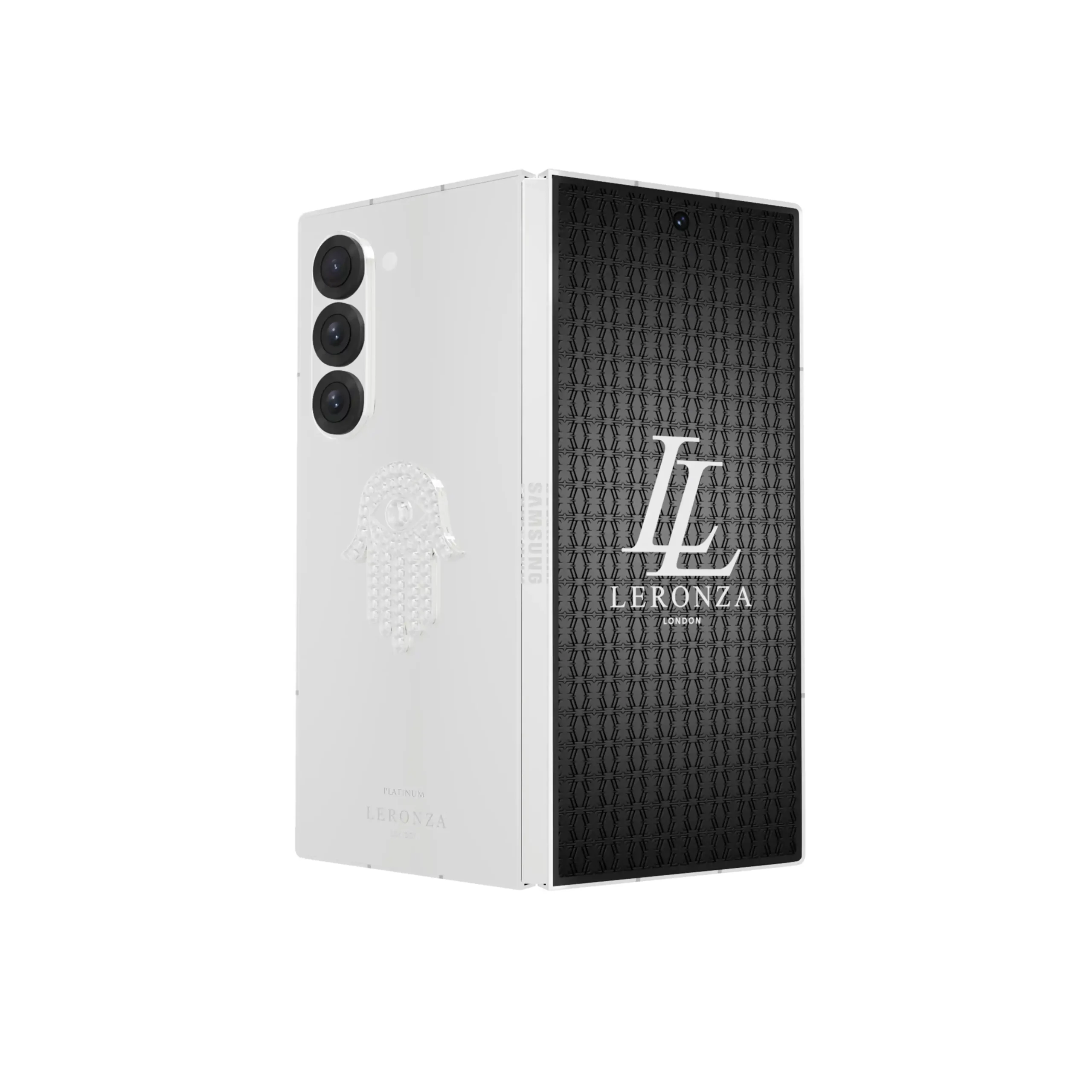 The Leronza Solid Gold Samsung Galaxy Z Fold7 Seraphic Hamsa Blessing features world-class craftsmanship, with the case and backplate plated in your choice of 24K Gold, Rose Gold, or Platinum, each with a thickness of 5 to 7 microns for a rich and enduring finish. The custom design process allows you to personalize your device with a design, name, photo, or initials engraved on the backplate, ensuring your Fold6 is truly one-of-a-kind. At the heart of this exquisite design is the Seraphic Hamsa, a powerful symbol of divine protection and blessings, intricately crafted in 18K Solid Gold (weighing 20-25 grams). This beautiful icon is adorned with sparkling simulated diamonds, each representing purity and clarity, radiating a serene sense of grace and tranquility.